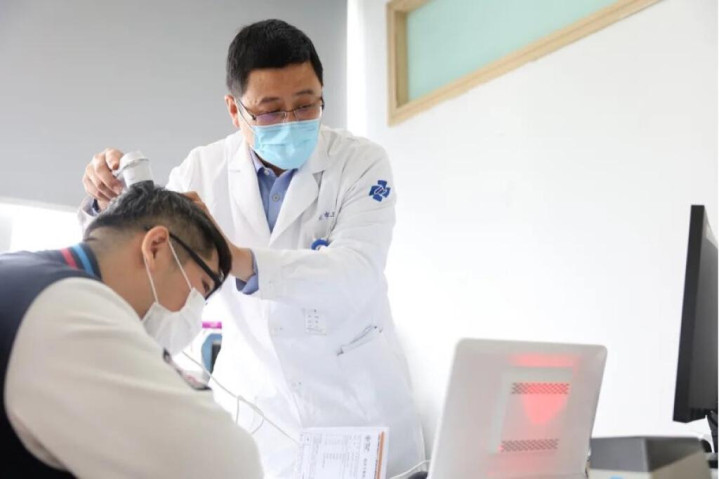 杭州市第三人民医院副院长宋秀祖在毛发专病门诊为患者检查。医院供图